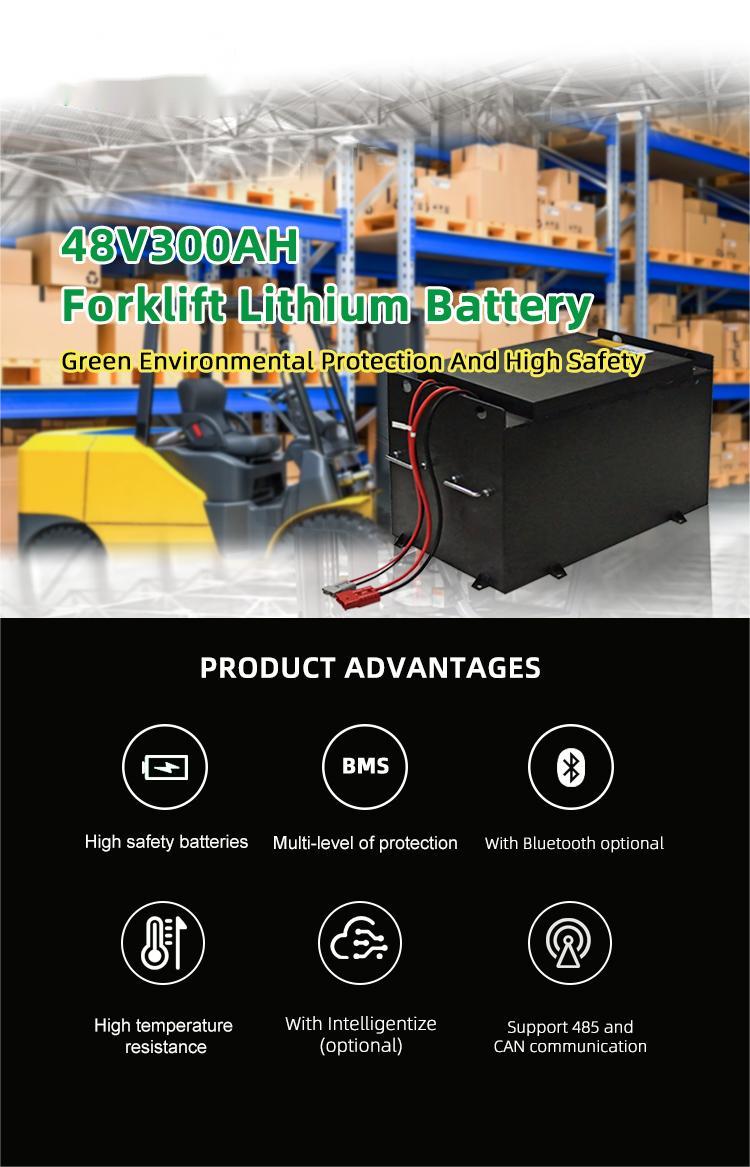 Applications des chariots élévateurs électriques : Les batteries LiFePO4 avec une tension de 48 V et des capacités de 300 Ah ou 80 Ah sont spécialement conçues pour les chariots élévateurs électriques.Ces batteries fournissent la puissance nécessaire au fonctionnement du chariot élévateur, lui permettant de soulever et de transporter de lourdes charges de manière efficace et sans émissions.
