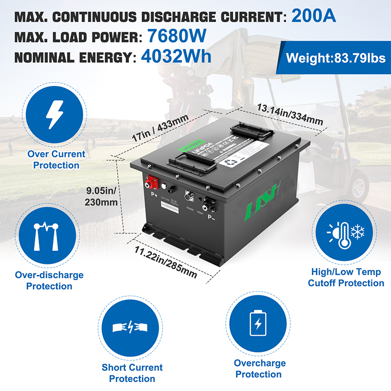 Voiturettes de golf : La batterie à décharge profonde 36 V 105 Ah est couramment utilisée dans les voiturettes de golf, fournissant la puissance nécessaire au transport sur les terrains de golf.Il permet aux golfeurs de se déplacer sans effort d’un trou à l’autre, offrant ainsi une expérience de golf fluide et agréable.